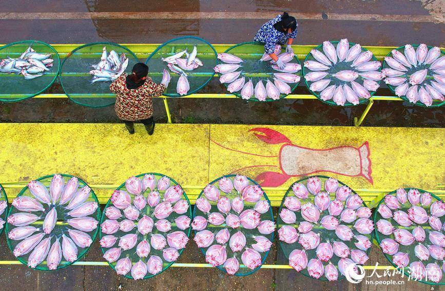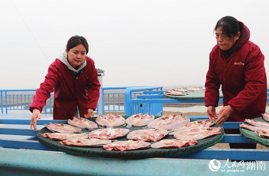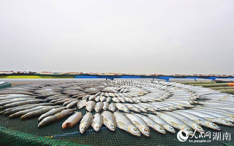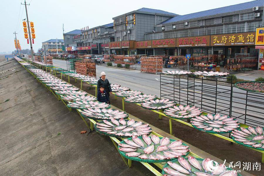 六门闸居民在晾晒风干鱼。人民网记者 刘宾摄来到湖南省岳阳市君山区六门闸生态渔村,风干鱼的鲜香味道,直往鼻孔里钻。暖阳下,1.6公里的“晒鱼长廊”上,一个个圆圆的竹簸箕整齐排列,上面铺满鲫鱼、草鱼、鳜鱼等不同种类的鱼干,泛着诱人光泽。湖风和阳光这两位“烹饪大师”,正为新年备下丰收的喜悦。