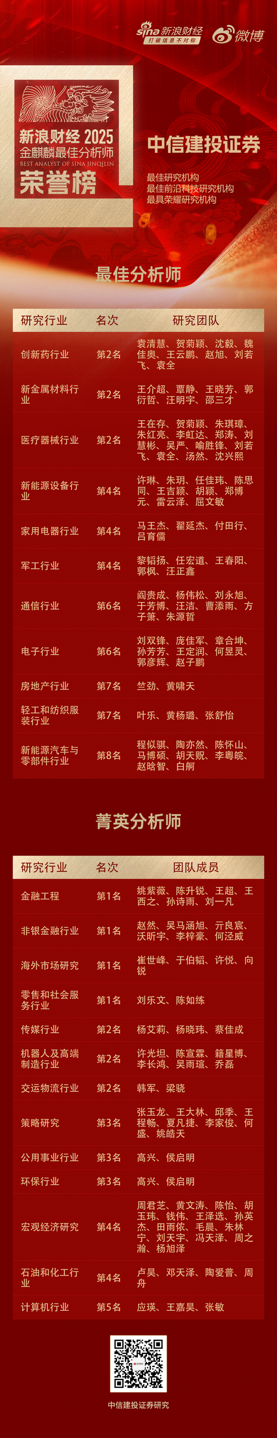 金麒麟最佳证券分析师评选是由新浪财经主办,面向证券研究机构分析师(不含基金研究方向分析师)及其所在机构开放,邀请买方对分析师及其所在机构进行投票的评选活动。旨在通过对研究机构、分析师的筛选,揭示中国资本市场的投资机会及风险,为投资人提供最有参考价值的评选结果。